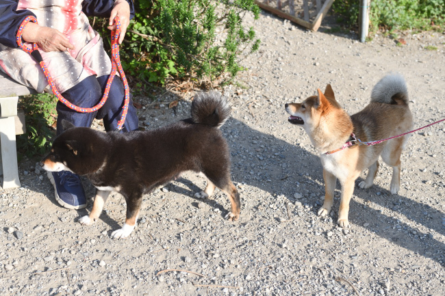 最初は二匹の圧にタダタジだった黒柴唯ちゃんでしたがすぐにご機嫌モードに。